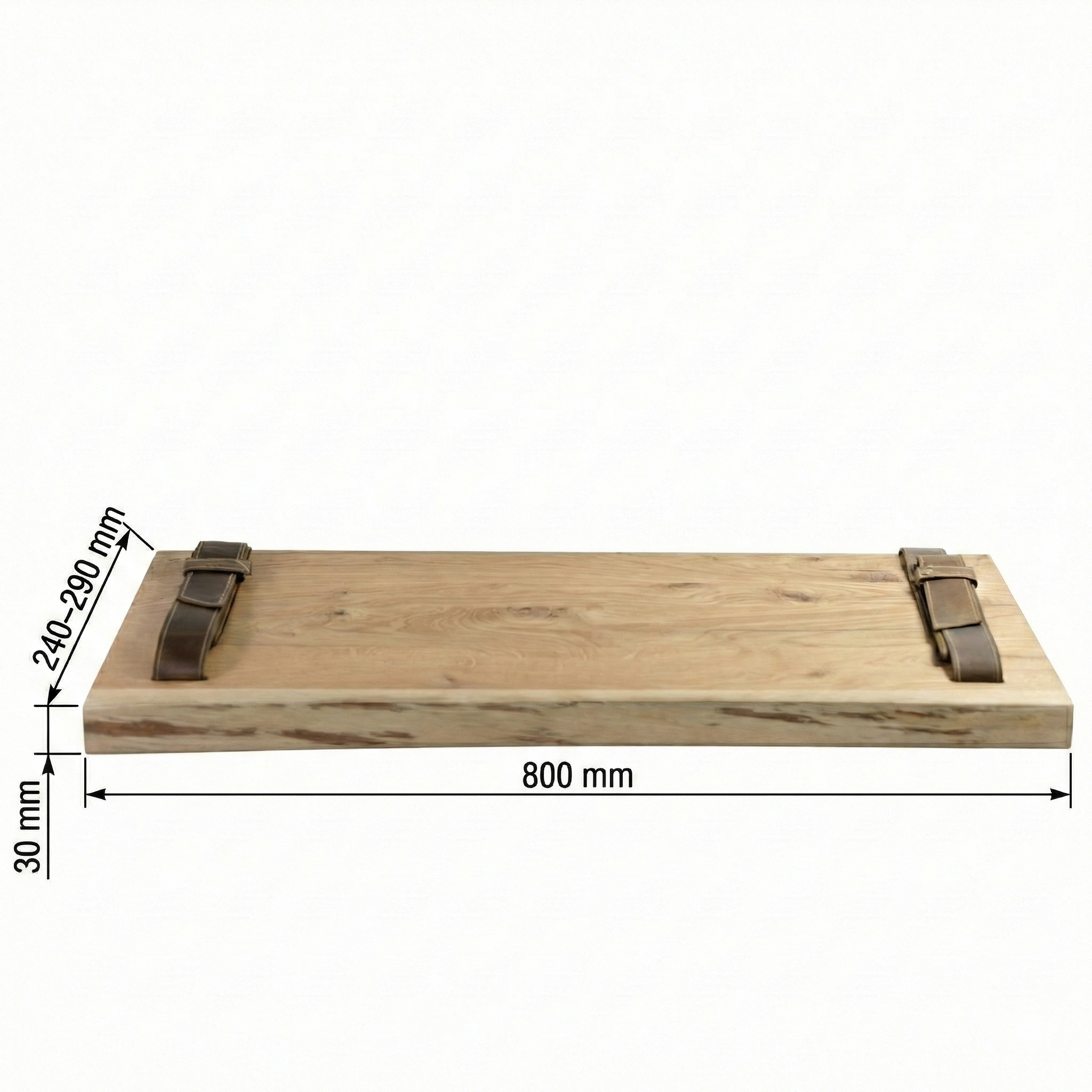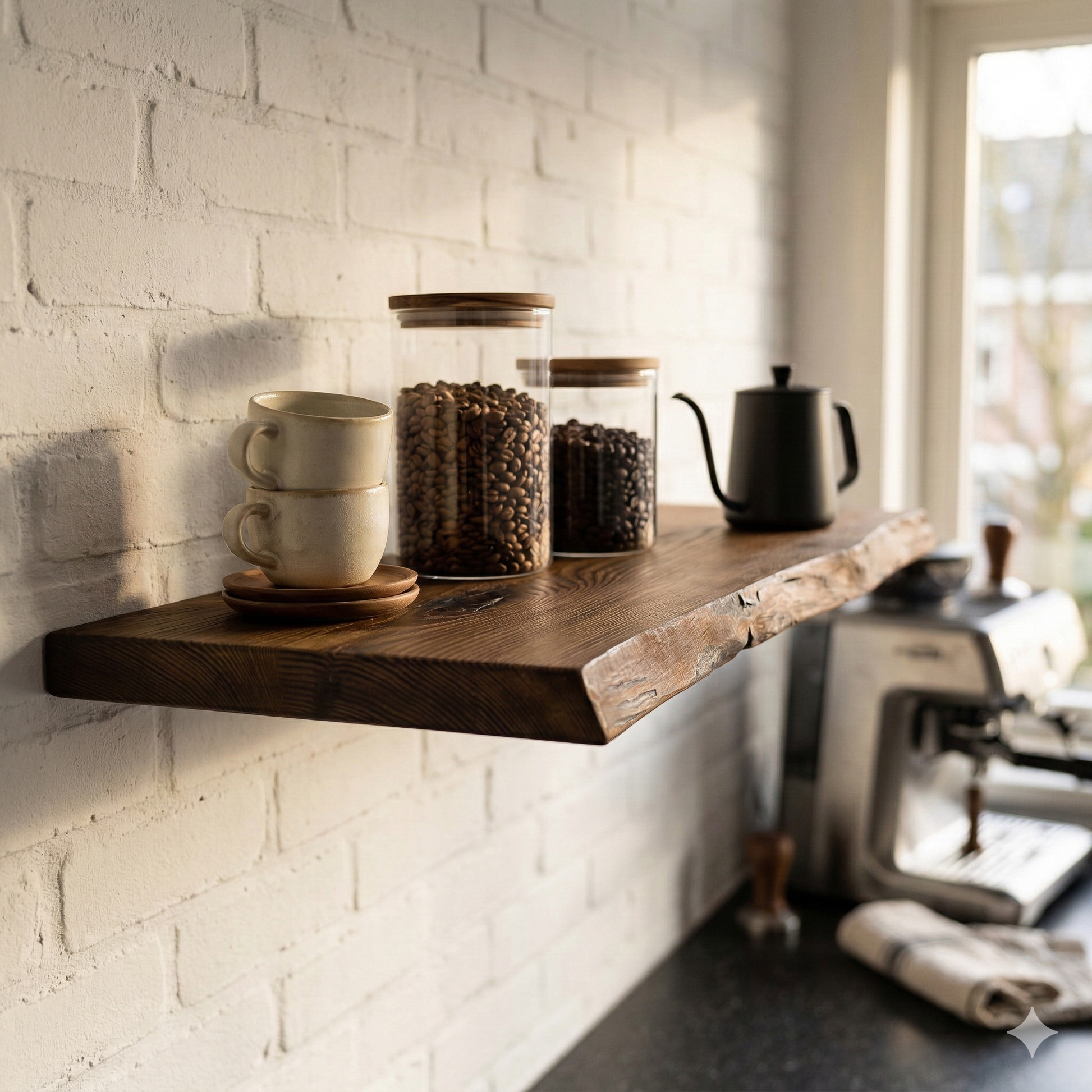 Een zwevende eikenhouten plank met een diepe, warme tint — zonder zichtbare bevestiging. Handgemaakt van 100% massief eiken met natuurlijke boomstam-rand.
